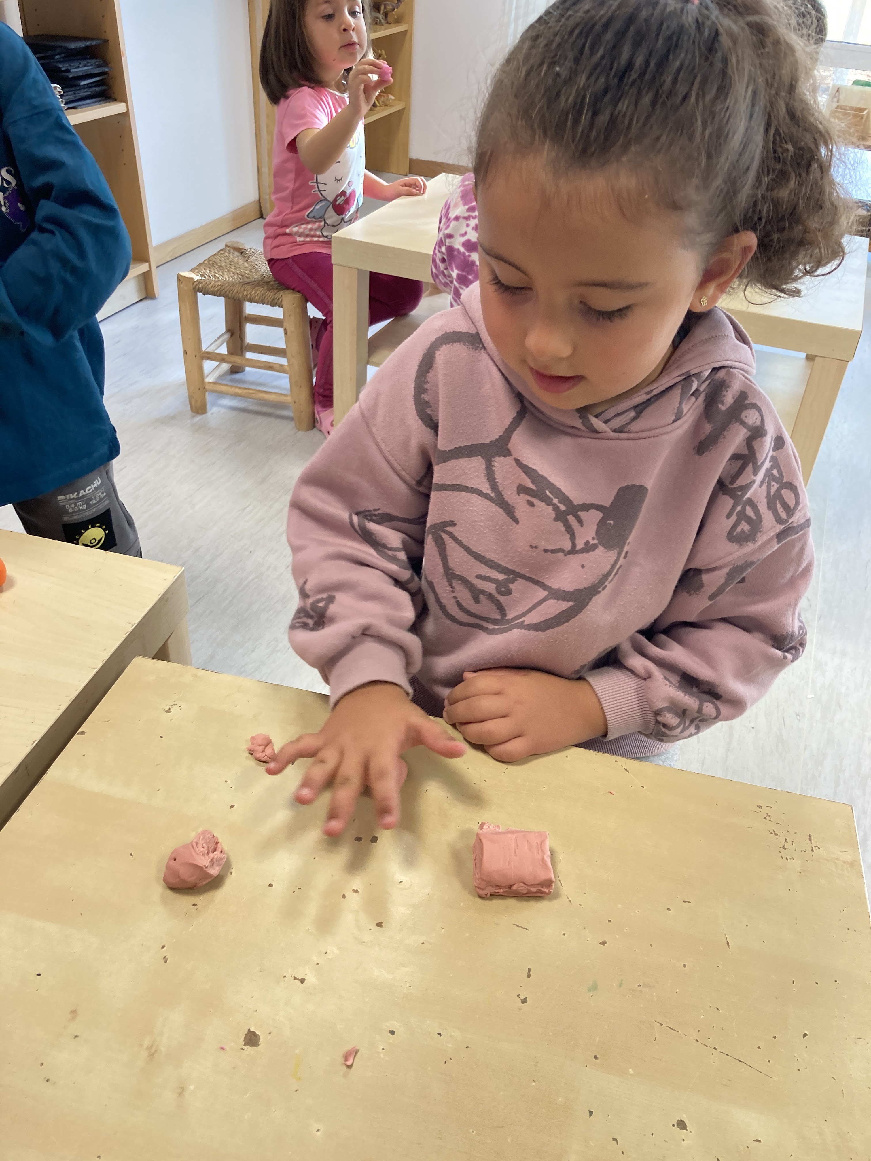 A més d'aquesta representació en dibuix, hem fet una representació amb plastilina d'un bebé abans de nèixer, amb el seu cordó umbilical, i l'hem posat en una cartolina on hem escrit la paraula "bebé", primer l'hem escrit entre tots en la pissarra i desprès cadascun l'ha copiat a la seva cartolina: